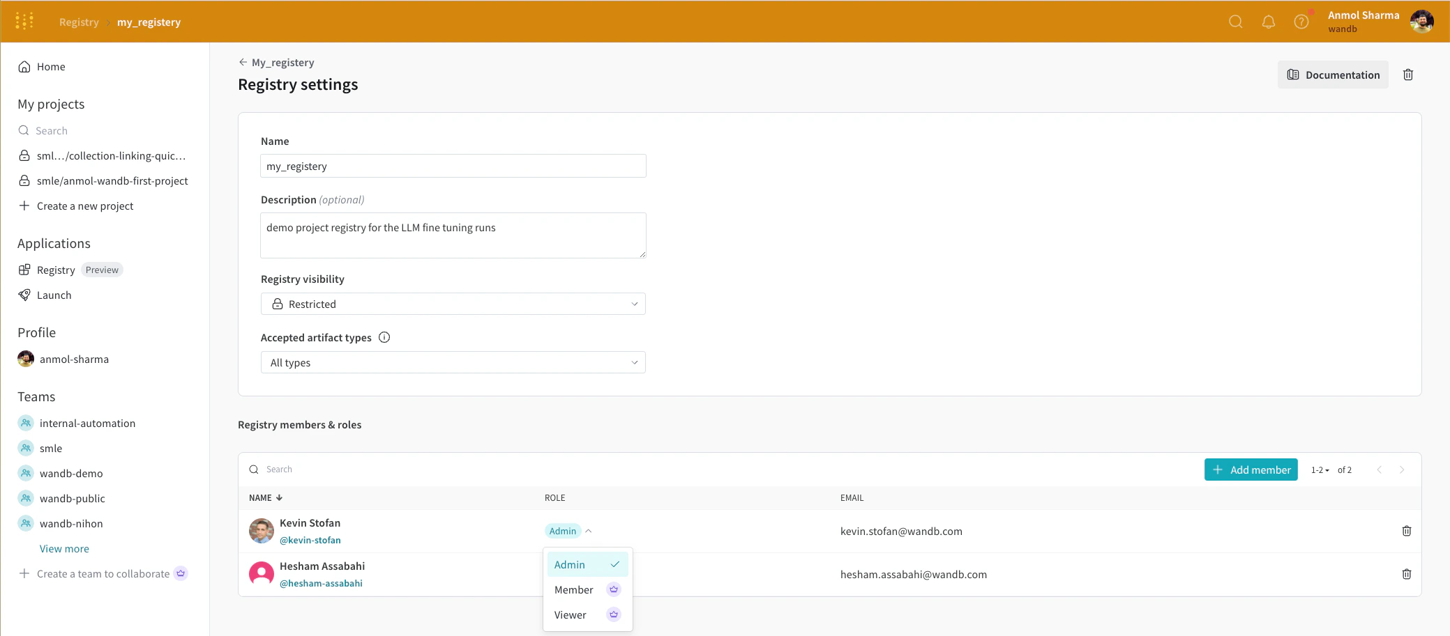 移行後、モデルレジストリは組織レベルの公開範囲を持つようになります。レジストリへのアクセスを制限するには、役割の割り当て を行うことができます。これにより、特定のメンバーのみが特定のレジストリにアクセスできるようにするのに役立ちます。 この移行は、旧 W&B モデルレジストリでの現在のチームレベルの登録モデル(まもなくコレクションと呼ばれる)の既存の許可境界を維持します。旧モデルレジストリで定義された権限は新しいレジストリでも維持されます。つまり、特定のチームメンバーに制限されているコレクションは、移行中および移行後も引き続き保護されます。