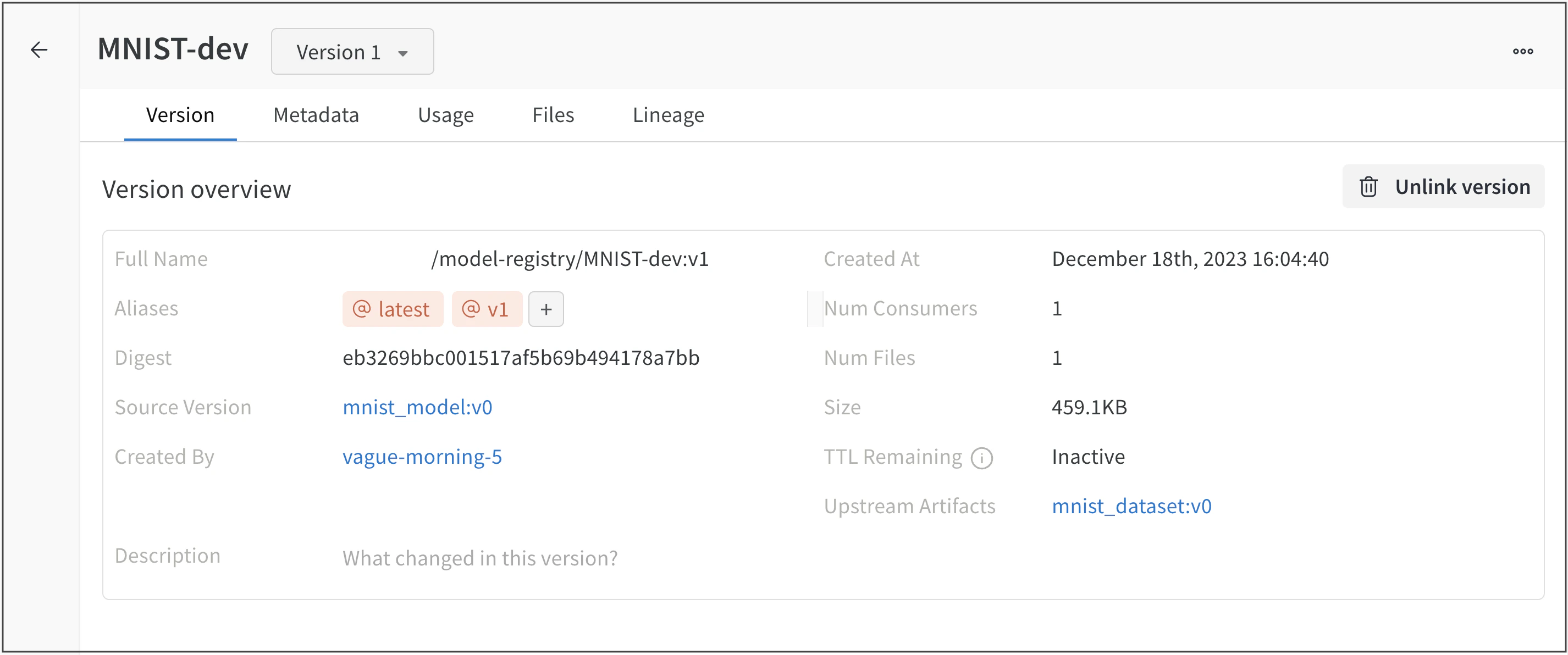 MNIST-dev라는 등록된 모델에 연결된 v0 모델 버전 mnist_model을 보여줍니다( Source version 필드 mnist_model:v0 참조).