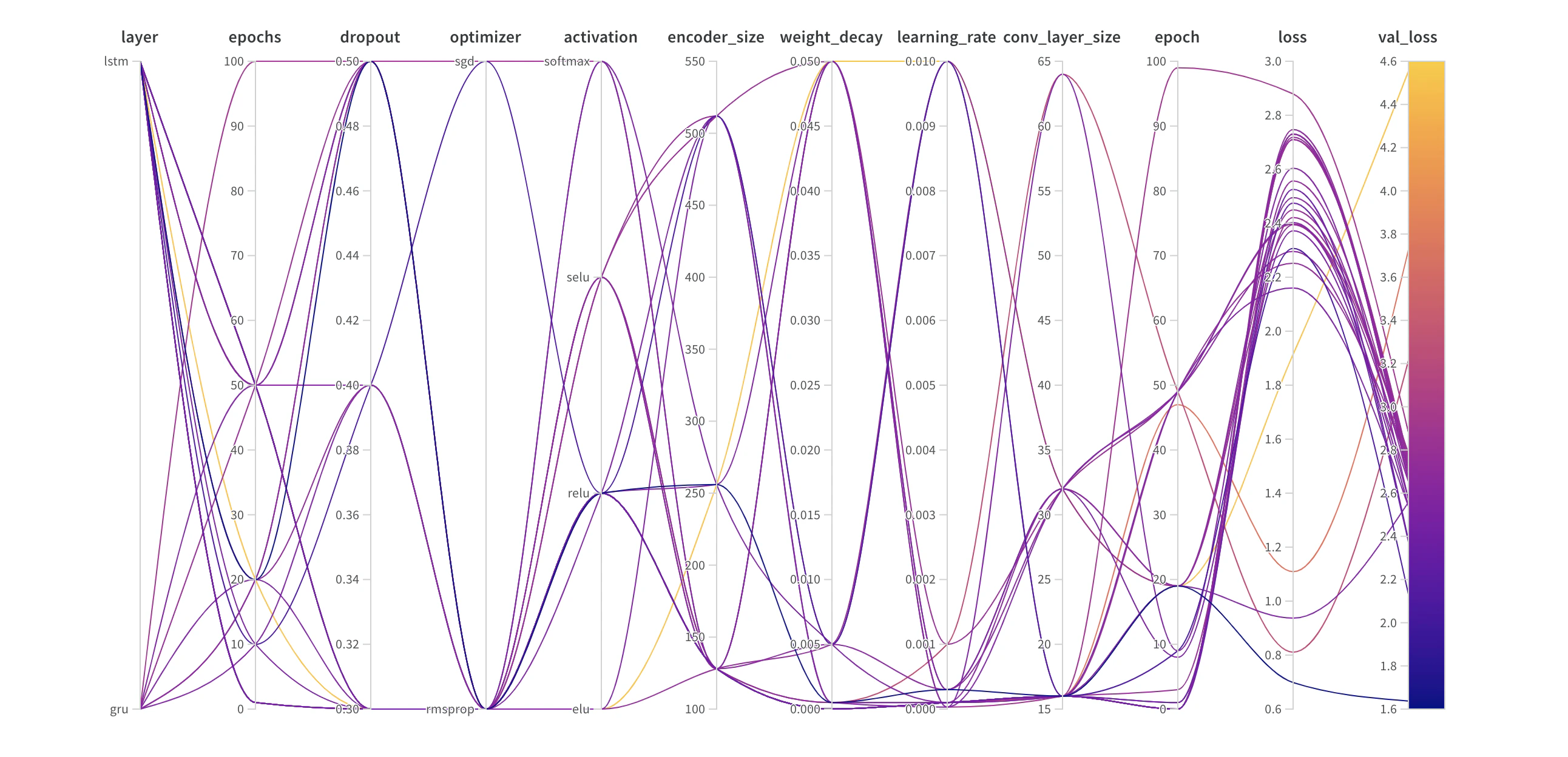 잠재적으로 무한한 옵션이 있는 하이퍼파라미터의 경우 일반적으로 몇 가지 선택한 values를 시도하는 것이 좋습니다. 예를 들어, 앞의 스윕 구성에는 layer_sizedropout 파라미터 키에 대해 지정된 유한 값 목록이 있습니다.